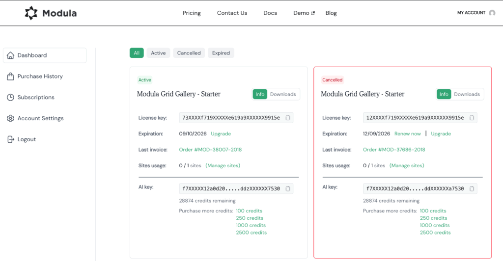 Go to the Modula checkout page > Add the product to your cart, then select the Renew an Existing License option > Enter your license key, and complete the checkout process.