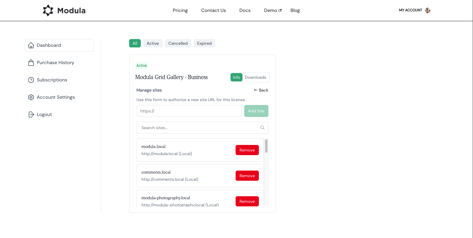 -> Access your Modula account here > Go to My Account > Dashboard and use the toggle to switch to Downloads.