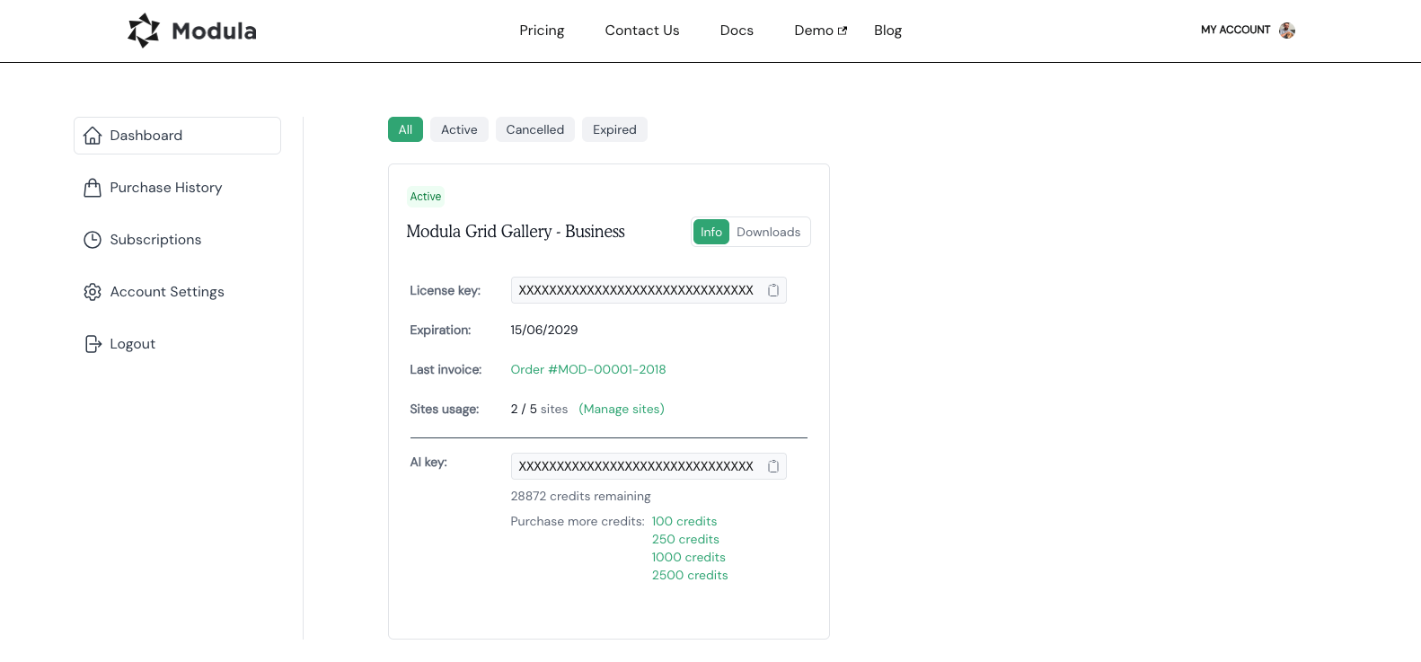 All license keys are valid for 1 year from the purchase date. An active license key is needed for access to updates, support, and Modula’s image optimization and content delivery network.