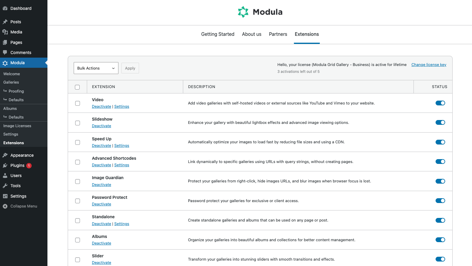 Installing Modula Pro extensions is a straightforward process. You just need to activate your license key, then enable the extensions available for your purchased plan.
