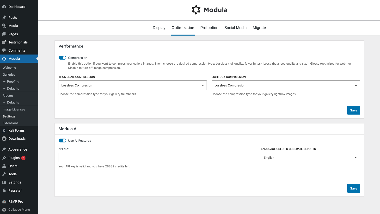 In your WordPress dashboard, go to Modula > Settings > Optimization > Modula AI. Paste the API key into the API KEY field and click Save API Key. Here, you can also monitor your remaining credits.