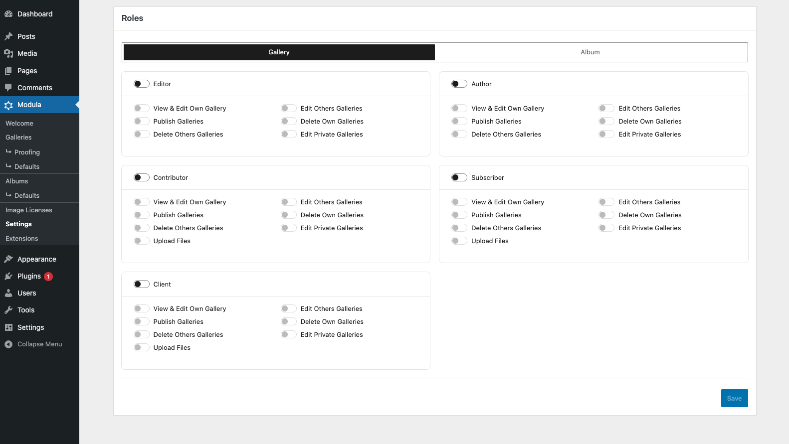 This extension offers granular control over which user roles can add, edit, delete, or update galleries on your website. Add permissions to an existing user role or remove them by simply checking the correct checkboxes.
