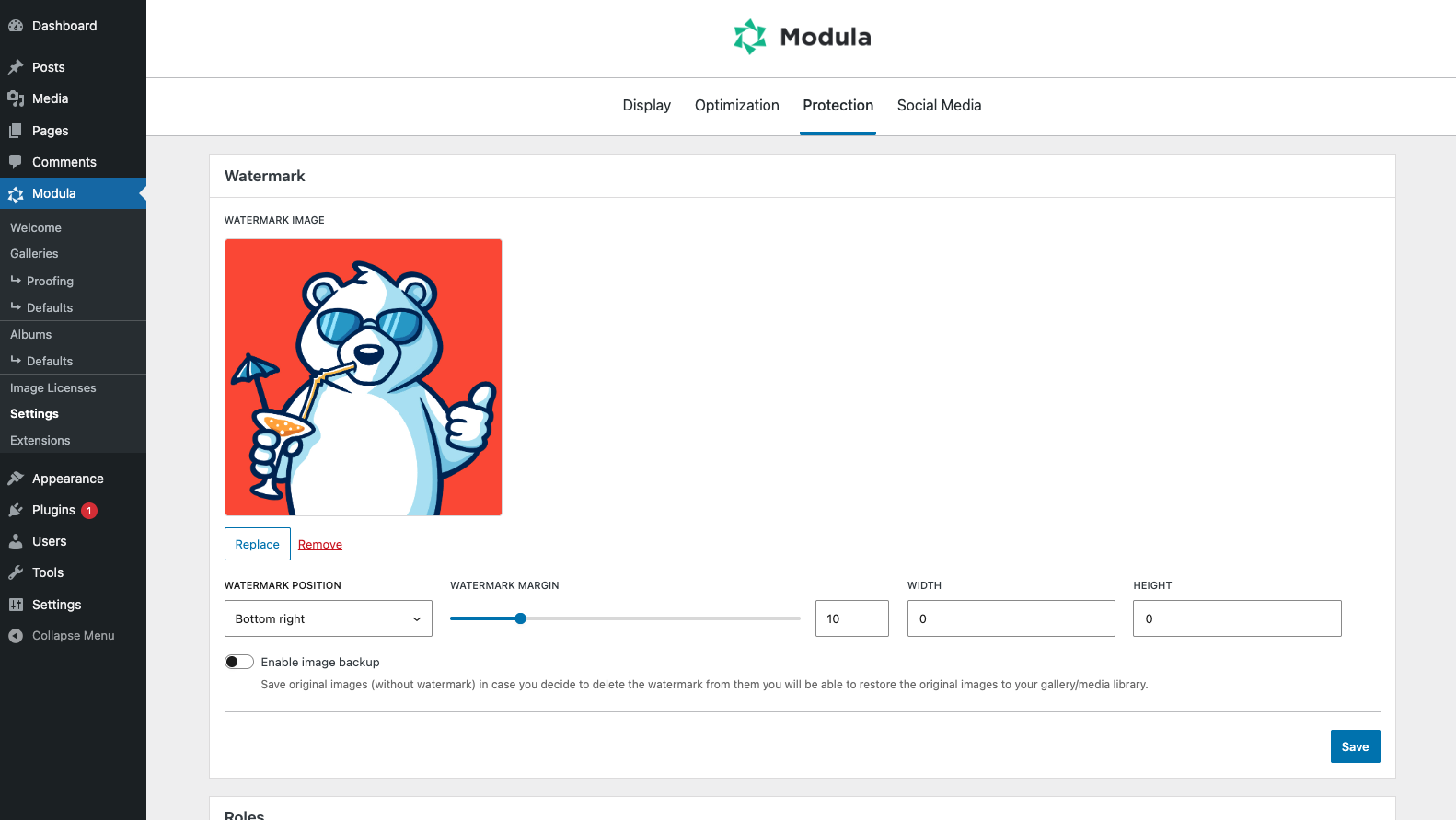 To apply your watermark to all of the galleries where this option is enabled, please go to your dashboard > Modula > Settings > Protection > Watermark.