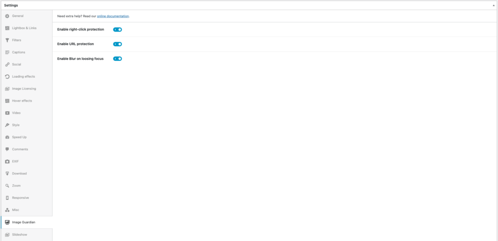 In the gallery settings, locate the "Image Guardian" tab, and toggle your desired protection options to "ON." - Save Changes