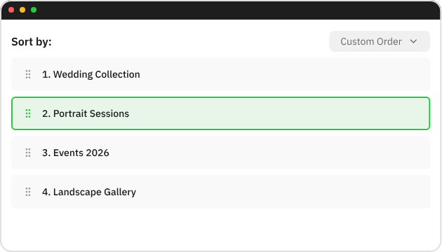 Sort albums by date, name, or custom order. Drag and drop to arrange your collections perfectly.
