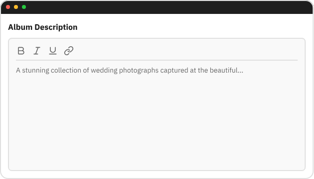 Group your galleries into stunning albums with custom covers, descriptions, and layouts.
