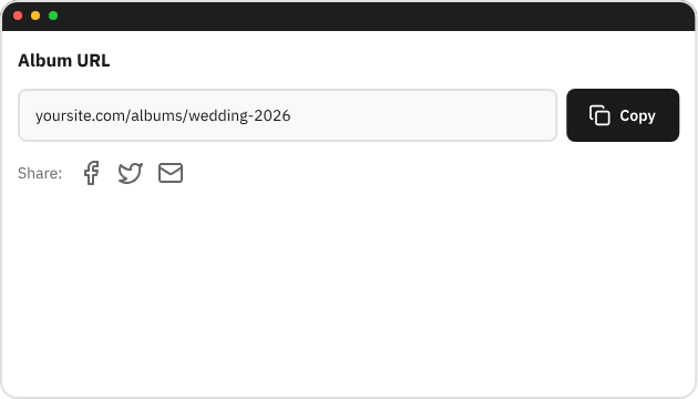 Each album gets its own shareable URL for easy linking and social media sharing.