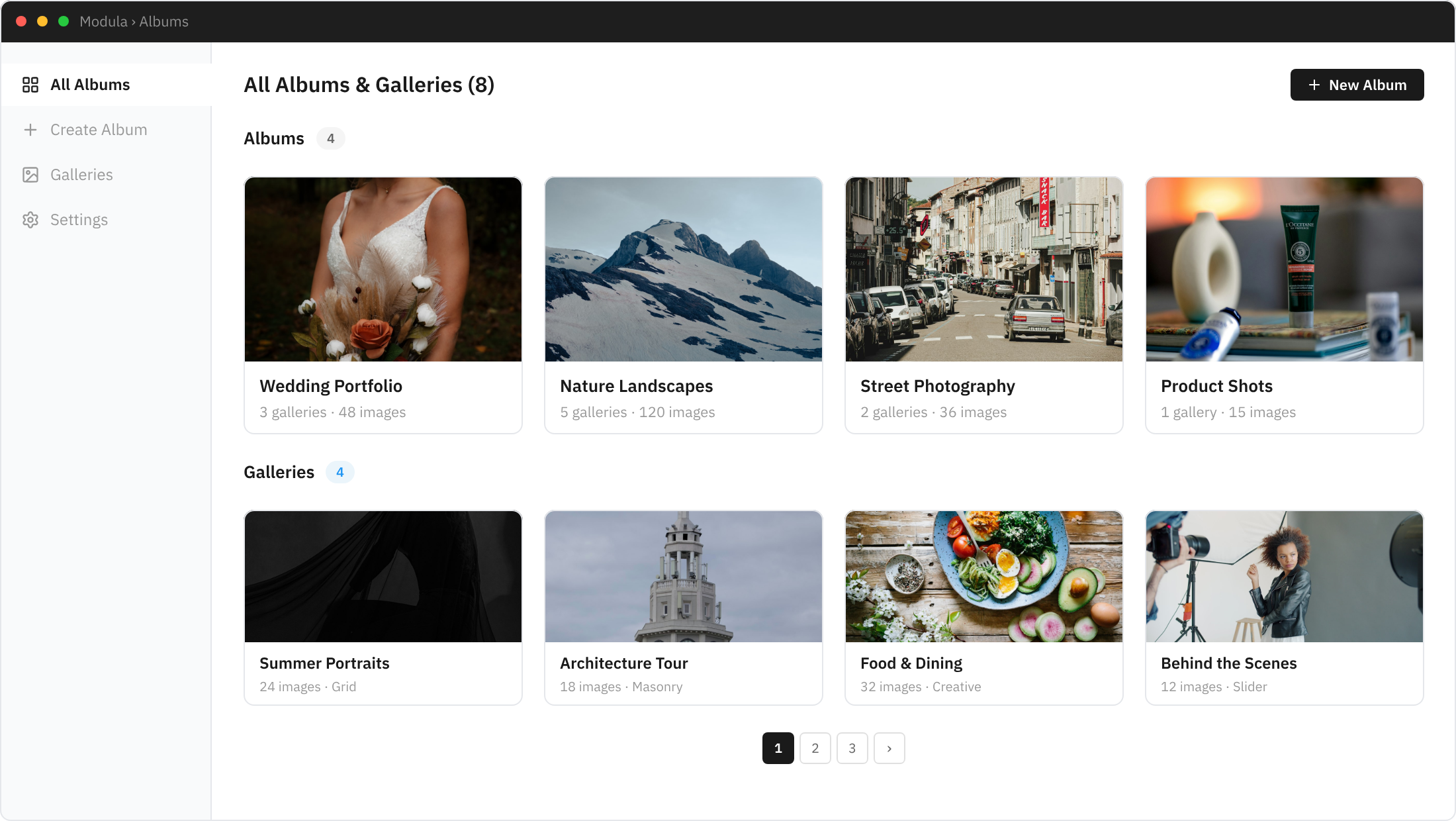 Albums can contain both galleries and other albums, so you can nest albums inside each other to build a hierarchy. This makes it easy to organize your galleries by category, event, client, or any structure that fits your workflow.