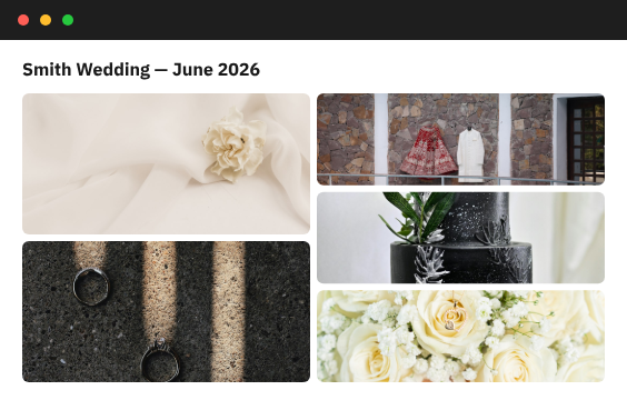 Organize ceremony, reception, and portrait shots into albums by event or couple.