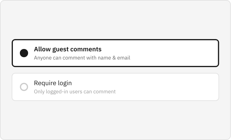 Allow anyone to comment without an account, or require login — fully configurable to match your community needs.