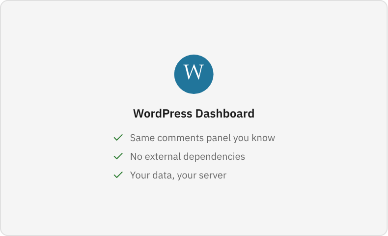 Built on WordPress core comments system. No separate database, no external service — just your familiar WordPress dashboard.