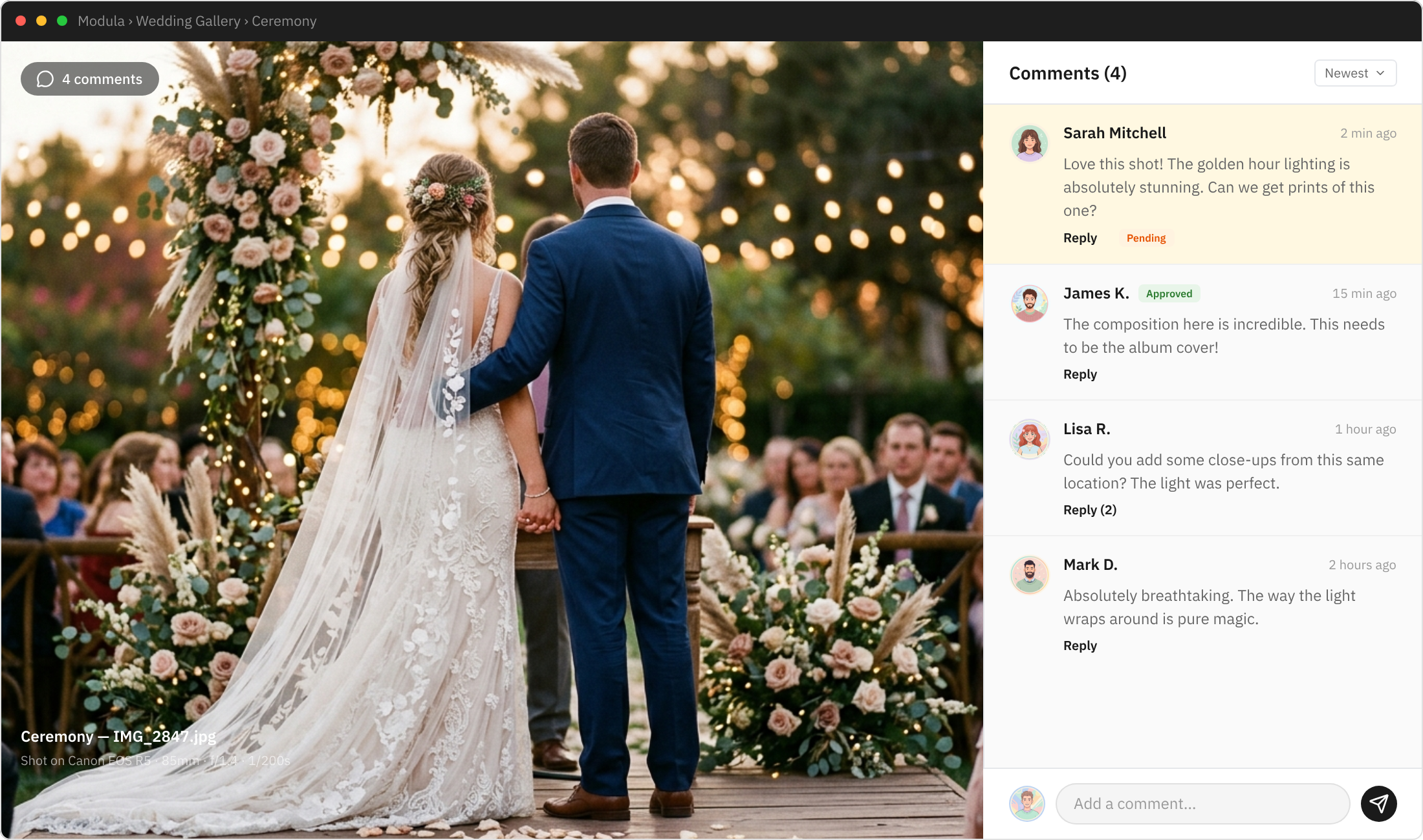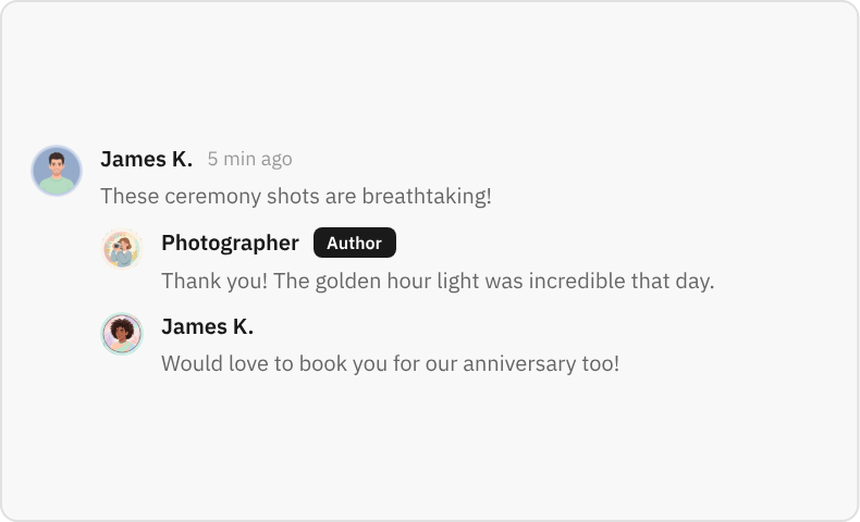 Visitors can leave comments on specific images, not just the gallery page. Every photo becomes its own focused conversation thread.