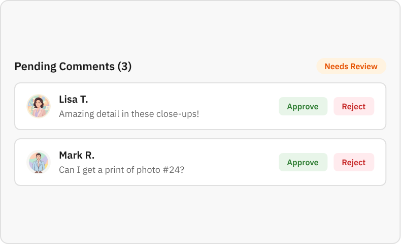 Approve, edit, or delete comments before they go live. Full moderation tools keep your galleries professional and spam-free.