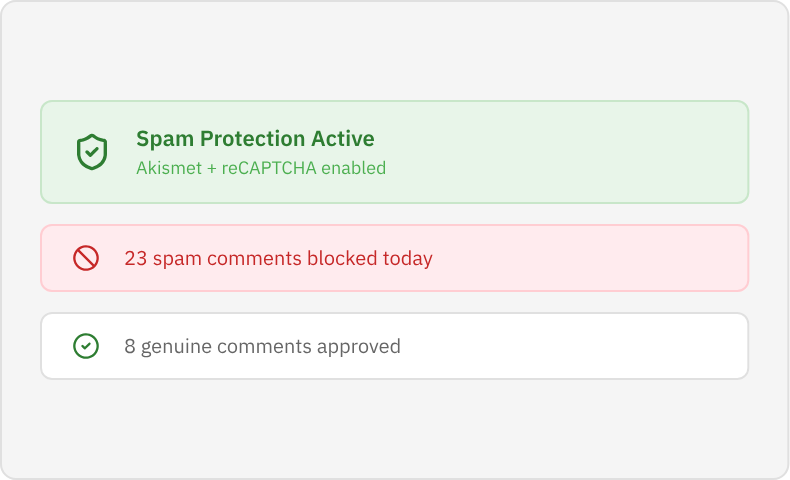 Built on WordPress native comments — works automatically with Akismet, reCAPTCHA, and any anti-spam plugin you already use.