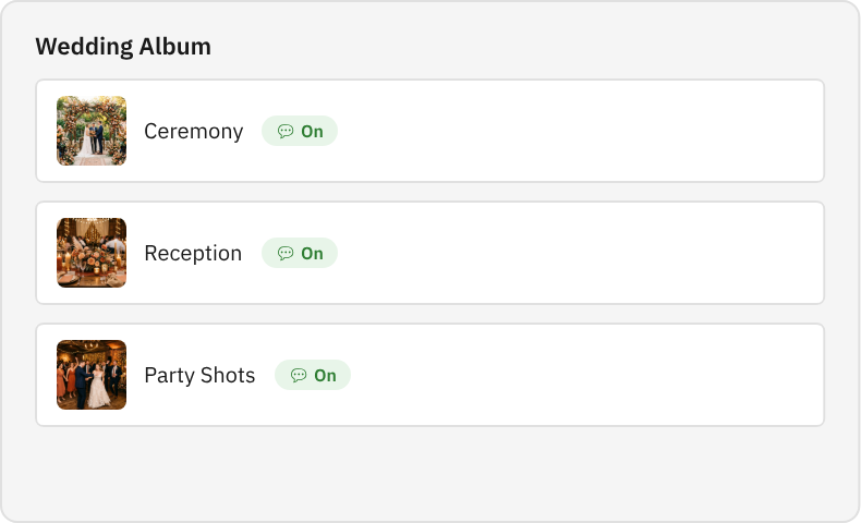 Enable comments across entire albums with a single toggle. Every gallery inside the album inherits the comment settings automatically.