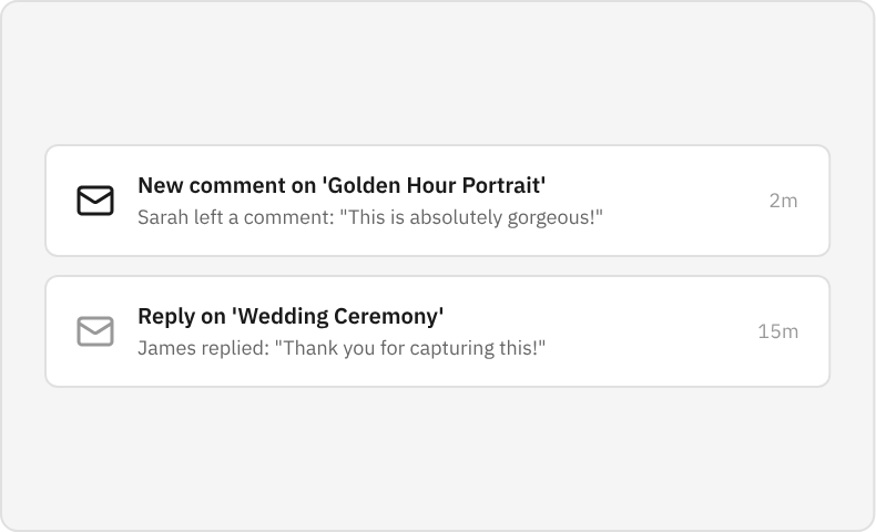 Get notified instantly when someone comments on your images. Never miss feedback or a conversation happening in your galleries.