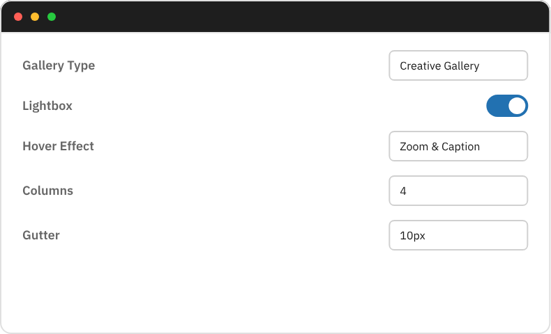 Set your preferred gallery type, lightbox behavior, hover effects, spacing, and more as defaults. Every new gallery inherits these settings automatically.