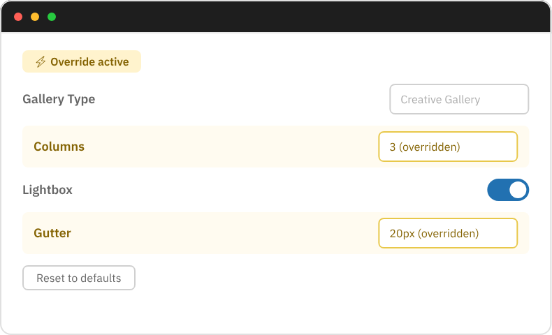 Need one gallery to look different? Override any default on a per-gallery basis without affecting the rest. Maximum flexibility, minimum effort.