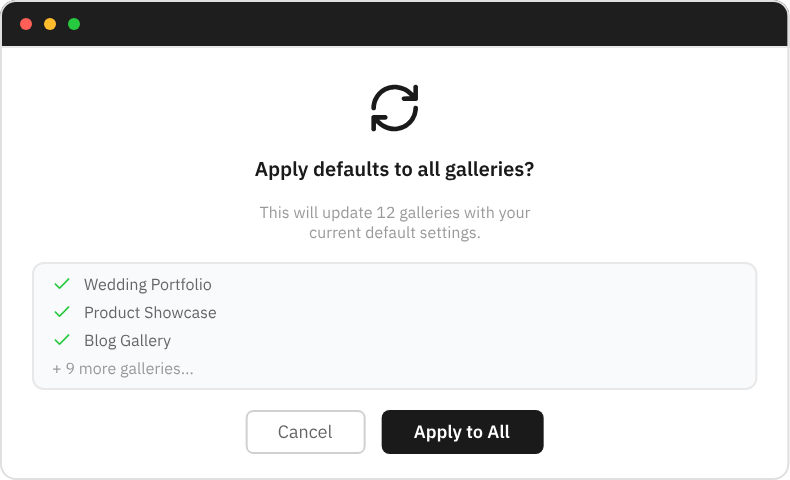 Changed your mind on a setting? Push updated defaults to all existing galleries in one click. No need to edit each gallery individually.