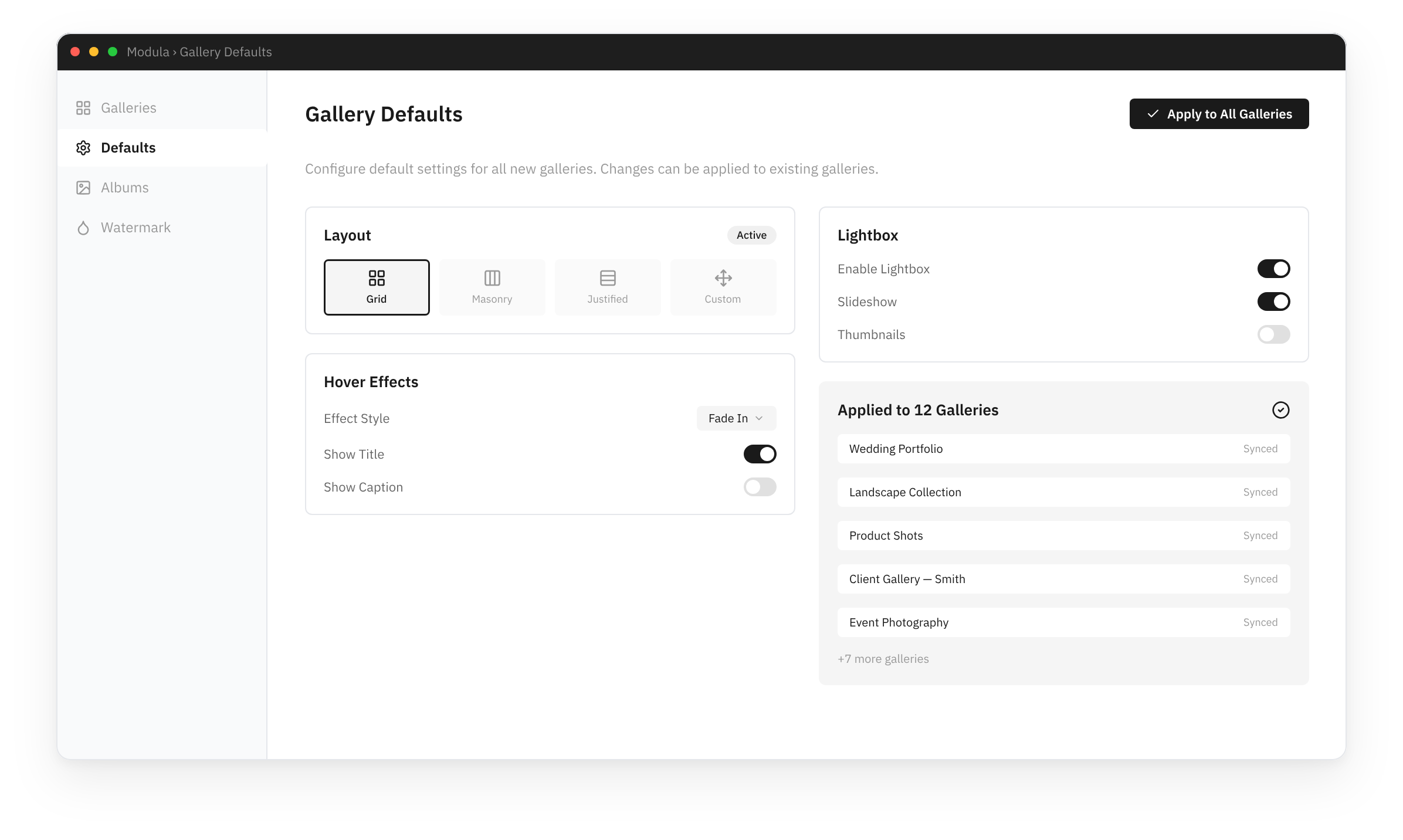 Configure your ideal gallery settings once and never repeat yourself. Every new gallery inherits your defaults automatically.