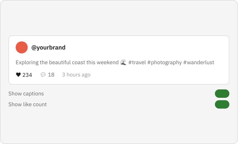 Show or hide captions, like counts, comment counts, and timestamps. Full control over what metadata appears with each post.
