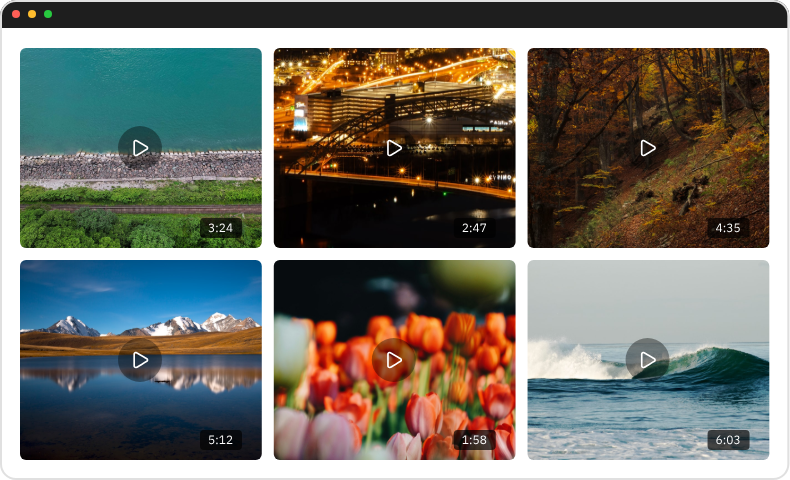 Every video gallery adapts perfectly to any screen size. Desktop, tablet, or phone — your videos always look their best.