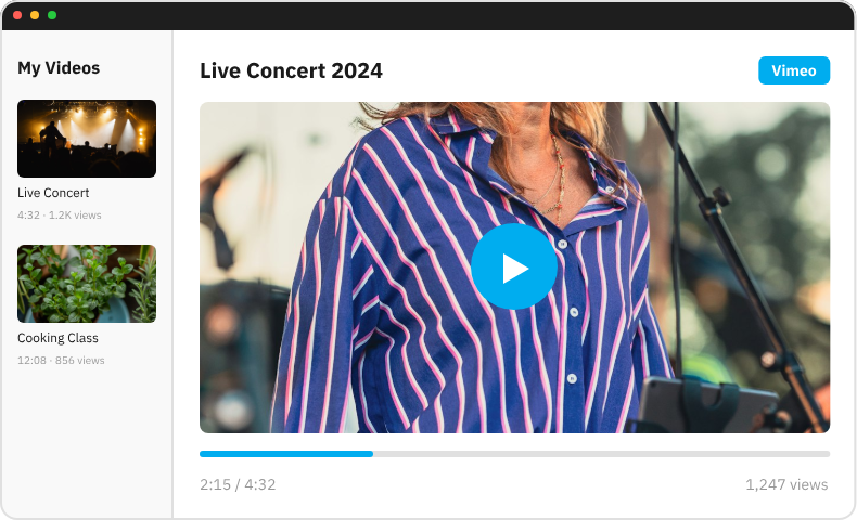 Full Vimeo support alongside YouTube. Import videos from your Vimeo account, showcase Vimeo portfolios, and use Vimeo’s privacy settings natively.